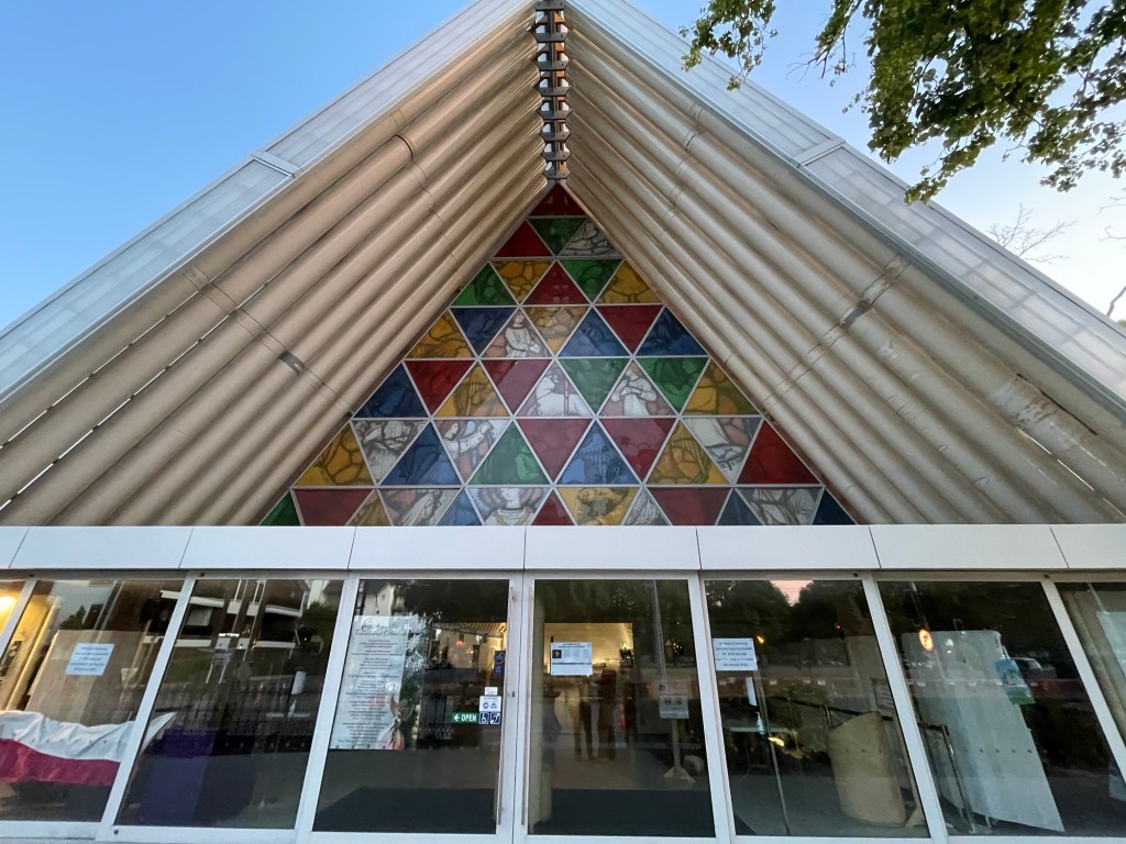 The former trolley station has been turned into a mall. The tracks still run right through it.Many bridges cross the river, which loops its way through town.We walked through the Botanical Gardens on the way, and photographed some roses.The Margaret Mahy Family Playground is the largest in New Zealand.We both found fun things to try.Take me to Church!The “Cardboard Cathedral”This Christmas window decoration features an I-Spy challenge.