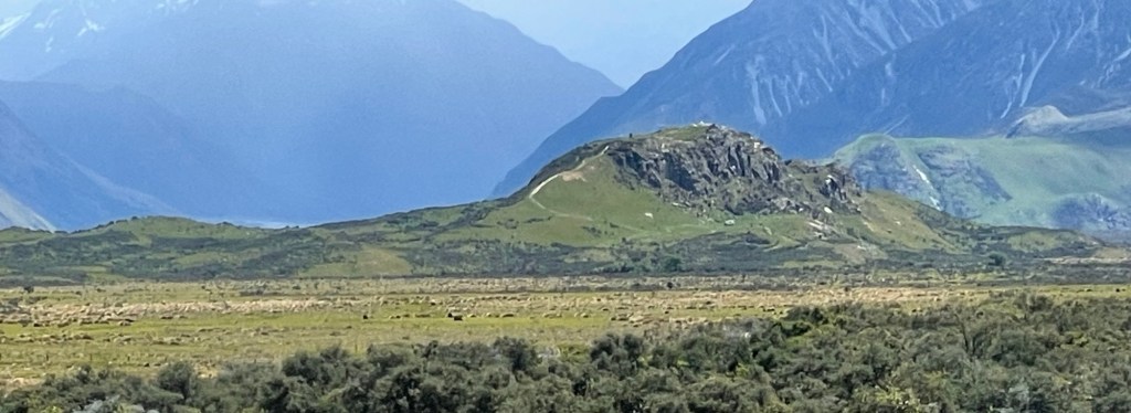 Our adventure to New Zealand is coming to an end, and this will be our last post for the trip because all we do tomorrow is fly home. We wanted something memorable for our last full day, and what could be better than to visit a beautiful natural site that also happens to be one of the most striking locations in the Lord of the Rings movies? That’s right, today we visited Mount Sunday, whose cinematic alter ego is Edoras, the capital of Rohan. You may recognize its craggy ridgeline in the photo above, although it may look somewhat different without its encrustation of Viking buildings and the golden hall of Meduseld glinting at the top.
