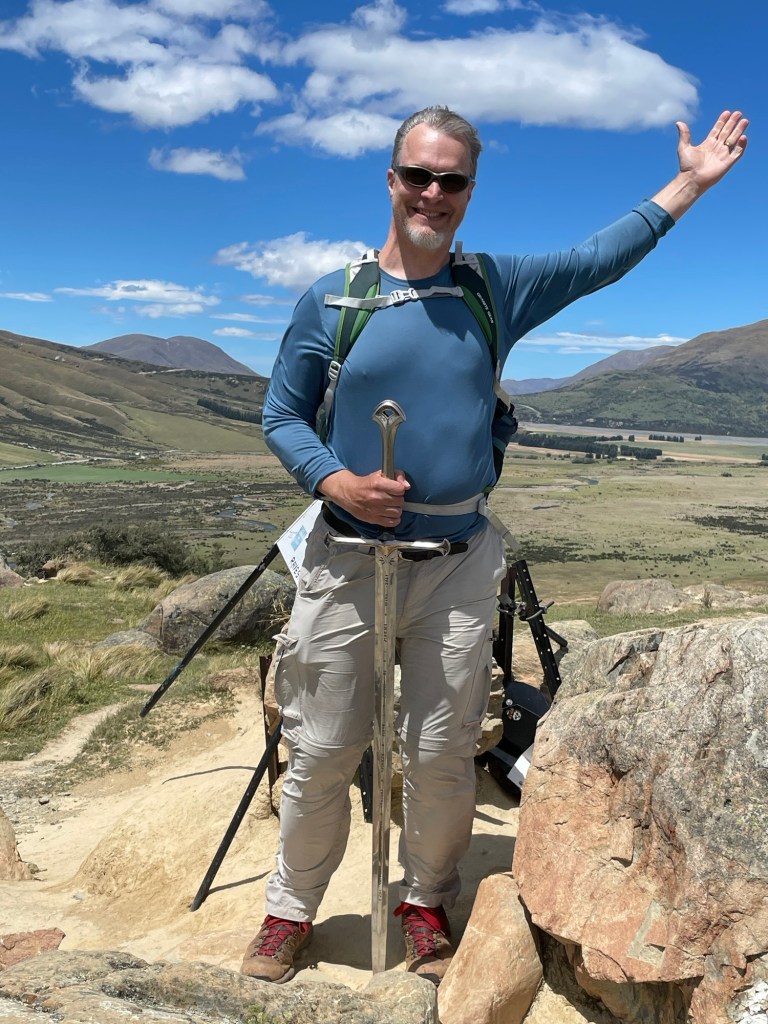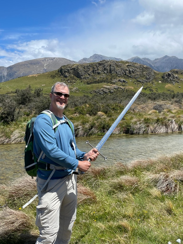 Mount Sunday is hard to reach without a car, lying about a two hour drive from Christchurch, partly on gravel roads. Since we had already returned our rental several days ago, for this day trip we opted to sign up with a tour company (the promisingly-named Hassle-Free Tours) who would take us there and back. As a bonus, we heard movie backstory on the way there and back, and our guide even brought along some movie prop replicas for our use in case we wanted to take pictures with them.