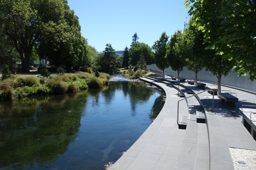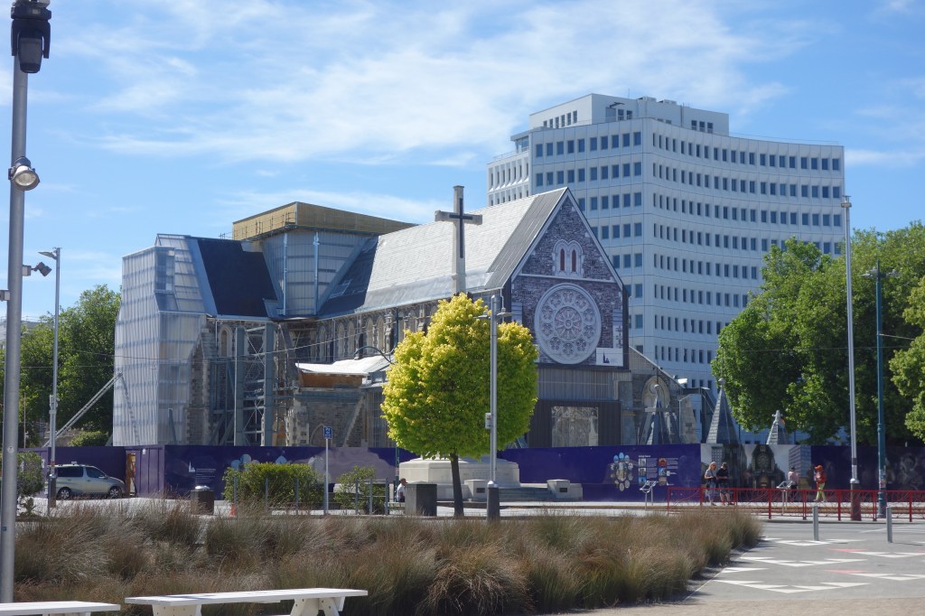 Today Susannah was busy all day attending her conference, so Nick set out to explore the city on foot. First on the agenda was a two-hour walking tour around the CBD. This area has been utterly transformed since a series of severe earthquakes hit the city in 2010-2011. It was the second of the four quakes on Feb. 11, 2011 that did the most damage. Although technically not as strong as the 2010 temblor, the epicenter strick much closer to the city center and liquefied much of the ground (a former swamp before being drained by settlers). Every building suffered some damage, and three quarters ultimately had to be pulled down. The iconic Anglican cathedral would have been cheaper to bulldoze and replace, but had such popular sentimental support that authorities decided to repair it. Unfortunately, the insurance payment was insufficient to complete the job, so it now stands only partly finished, waiting for more funding. Although it doesn’t look too bad in this photograph, what you cannot tell is that the gable end with the beautiful rose window facing the camera is just plywood with a poster glued on top.